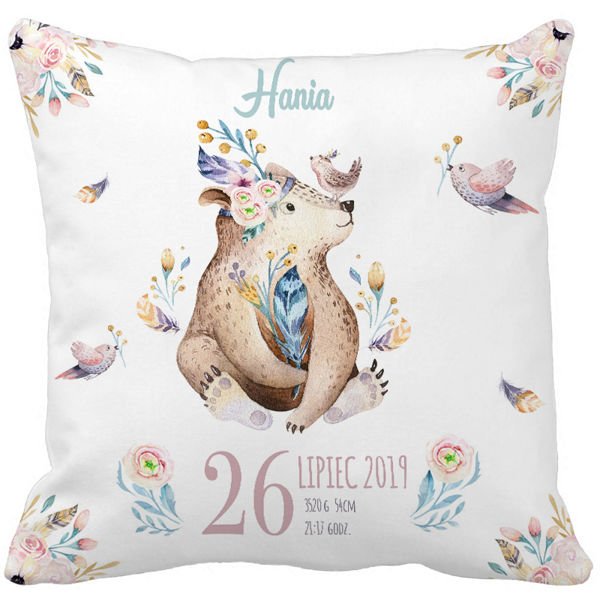 Poduszka metryczka, produkt spersonalizowany, pozwalający na umieszczenie imienia lub imienia wraz ze szczegółami z dnia narodzin dziecka. Nasz produkt to pomysł na niesztampowy prezent dla pociechy i zarazem wspaniała pamiątka - tak dla rodziców, jak i dla maluszka.