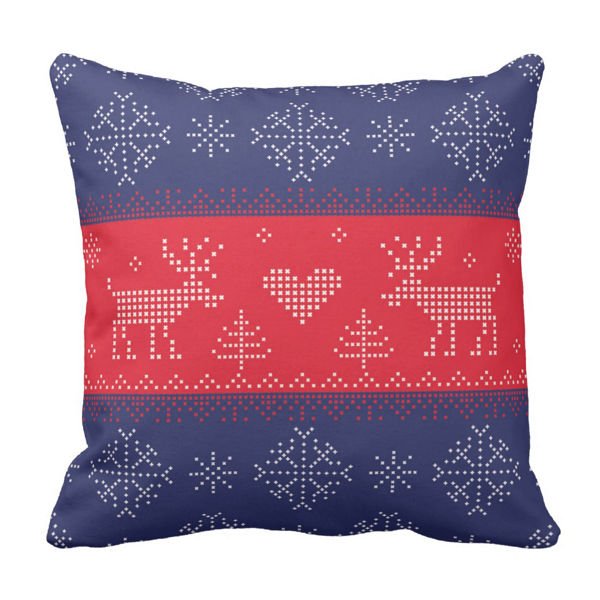 Zimowa poduszka ozdobna z motywem reniferów oraz płatków śniegów. Poduszka typu: "jasiek". Poszewka wykonana z materiału impregnowanego poprawiającego odporność na wchłanianie płynów (ułatwia utrzymanie poduszki w czystości). Poduszka do salonu ale idealnie nadaję się także na zewnątrz na taras czy do altanki. Wkład poduszki wykonany z włókien silikonowych należących do grupy włókien wypełniających stanowiących odpowiednik syntetycznego puchu. Tył poduszki taki taki sam jak przód.